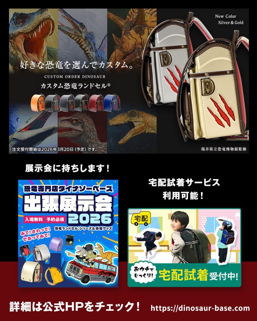 恐竜専門店ダイナソーベース様のオリジナルランドセル「カスタム恐竜ランドセル」ニューモデル(2027年入学)の、LP・SNS宣伝用画像など、Web販促物を一手に担当させていただきました。